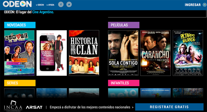 La plataforma de video a demanda (video on demand, VOD) Odeón, lanzada por el Instituto Nacional de Cine y Artes Audiovisuales (Incaa) y Arsat, pondrá al servicio de los fanáticos del cine argentino un nuevo servicio que será el de una ventana que permitirán ver los estrenos de la industrial local en simultaneo con los Espacios INCAA.