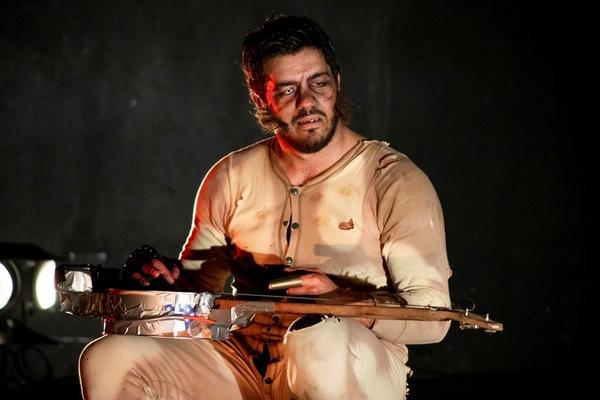 Un banjo electrónico que trae ecos del blues estadounidense y con esa herencia de la música cajún, nos lleva, inevitablemente, al western. El personaje, algo oscuro, comienza su monólogo diciendo “Aquí me pongo a cantar”. Y así se larga a contar su historia, un discurso en verso de clave gauchesca, que sostendrá durante toda la obra.