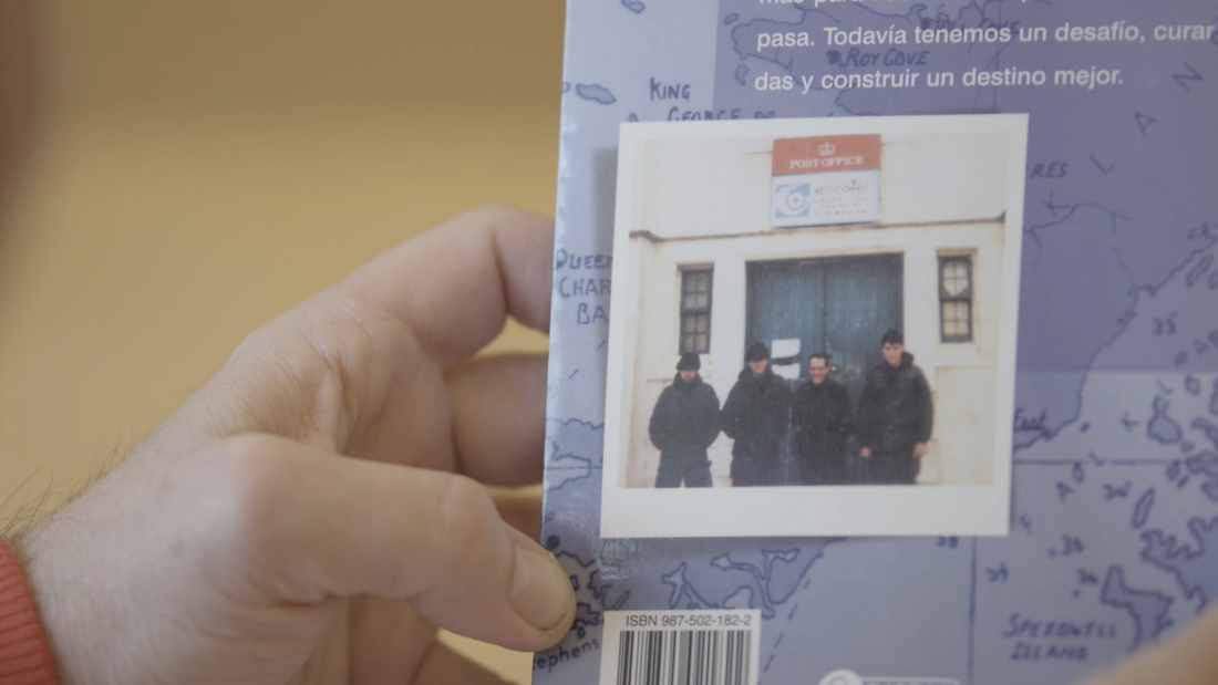 La experiencia de Fabián en Malvinas la tenemos a partir de fragmentos de su libro leídos en off por Rafael Spregelburd. En estos pasajes se aprecia la sensibilidad de aquel joven soldado contando tanto anécdotas como sensaciones, deteniéndose a veces en descripciones poéticas y detalladas de la fauna y del paisaje. Esta lectura es ilustrada por imágenes actuales de las islas cuya placidez contrasta con el frenesí de aquel entonces y en algunas de esas imágenes vemos a Javier recorriendo algunos de los lugares que alguna vez pisó su hermano mayor en circunstancias muy distintas. El propio Fabián, quien aparece entrevistado en el último tramo del documental, toma distancia y rechaza explícitamente la victimización.
