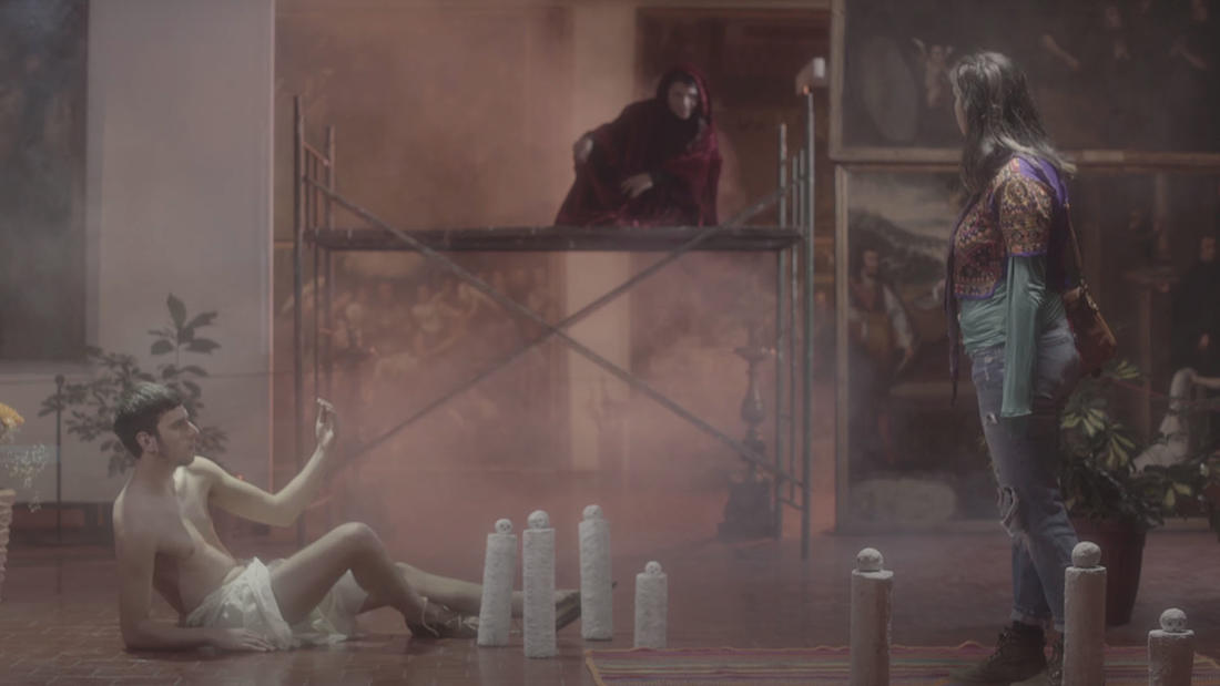 Un falso trabajador del centro impide el paso a un joven estudiante que busca a una compañera, pero ensaya raras explicaciones para permanecer en el interior del espacio; un supuesto hombre de negocios, que no negocia nada, es también cuestionado por este supuesto servidor público y este pronto es expulsado por la directora, que resulta no ser tal. Y todos ellos luego serán parte de dos extrañas situaciones: la búsqueda de un árbol energético que señala la existencia de un centro ceremonial y la escenificación de una escena sexual, extraída de un libro escrito en francés.