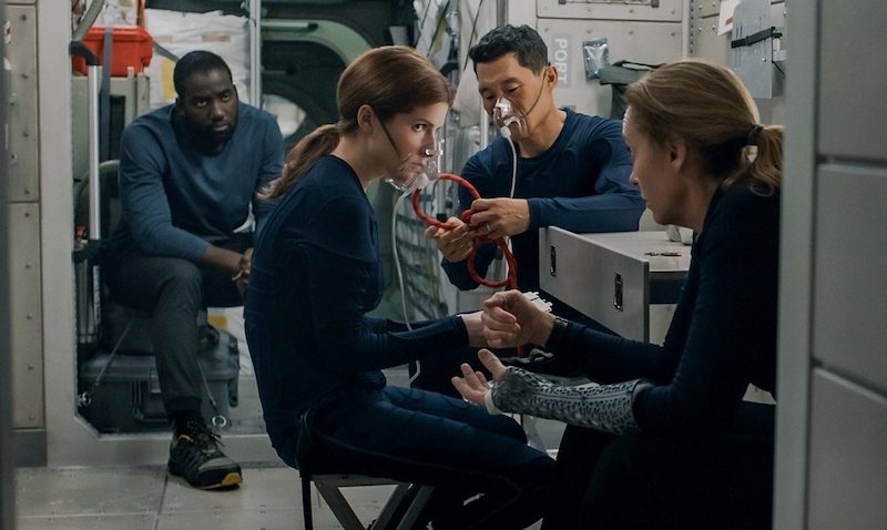 Mientras vemos la tensión en el proceso de despegue y la conexión espacial, los personajes mantienen comunicación con la base terrestre, al tiempo que desarrollan sus tareas en forma armónica mientras se familiarizan con el espacio reducido que les provee la nave. Bajo una buena convivencia, el equilibrio que forman se desestabiliza cuando la comandante encuentra un cuarto pasajero (Shamier Anderson) que nadie había detectado.