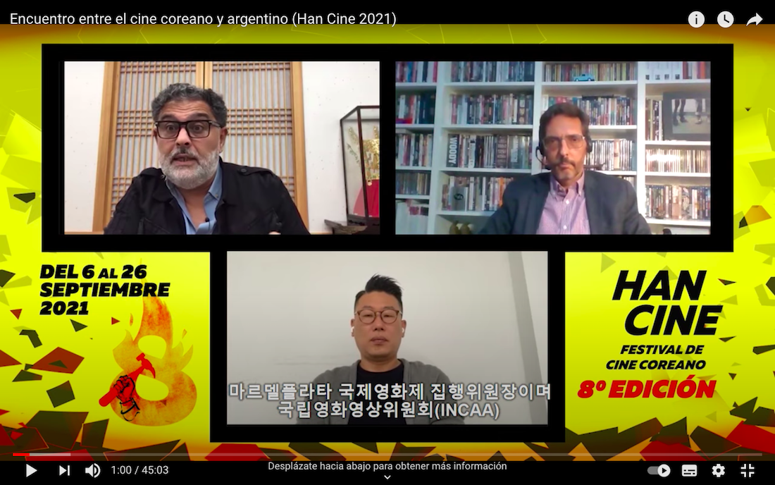 Como parte de la octava edición del Festival de Cine Coreano Han Cine, organizado por el Centro Cultural Coreano y el Instituto Nacional de Cine y Artes Audiovisuales (Incaa), que se extenderá hasta el 26 de septiembre en formato online a través de la plataforma Cine.ar Play-, se realizó un encuentro entre el cine surcoreano y el argentino, a través de una charla entre Kim Jung Suk, secretario del Korean Film Council (KOFIC) y Fernando Juan Lima, presidente del Festival Internacional de Cine de Mar del Plata, moderada por Hugo Sánchez, periodista de la Agencia Télam y el sitio Subjetiva.com.ar.