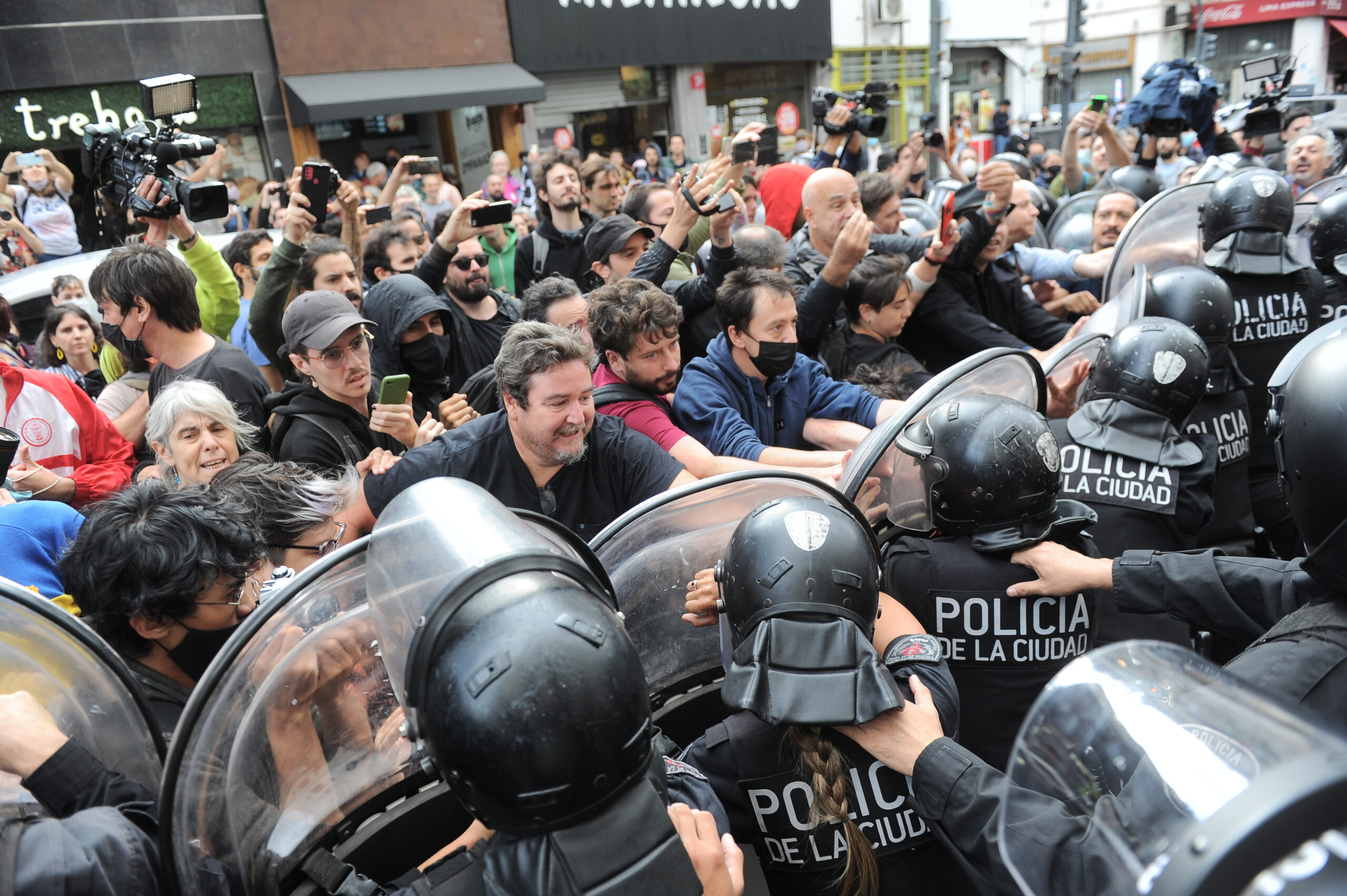 Los enfrentamientos cuerpo a cuerpo entre las fuerzas policiales locales y medio centenar de manifestantes se desarrollaron a raíz del corte total de la calle Lima, que bordea a la Nueve de Julio, en un operativo que incluyó la detención de algunas personas.